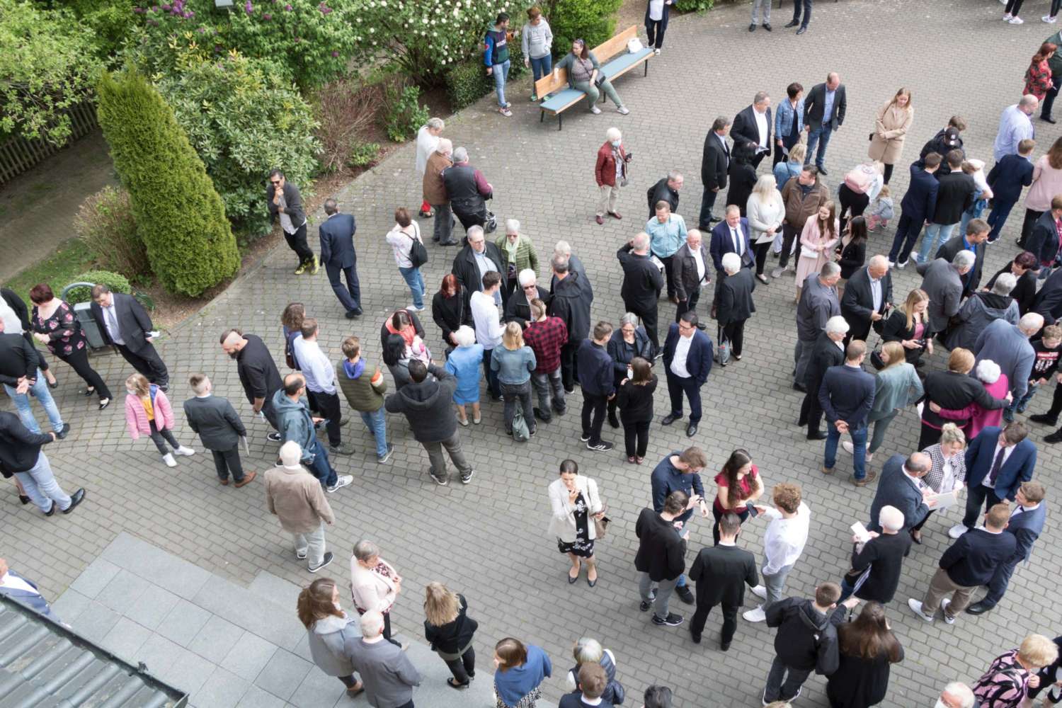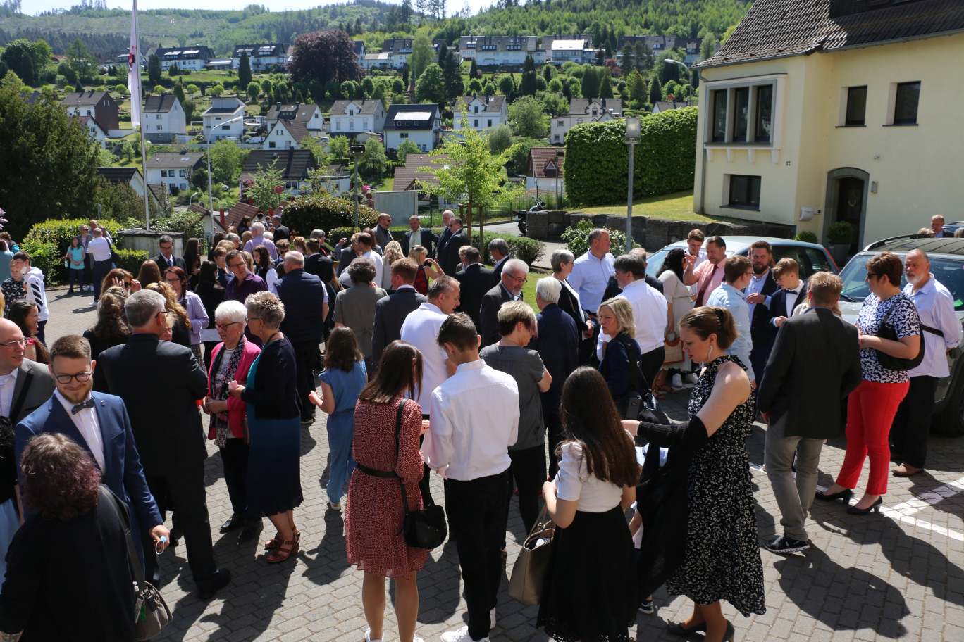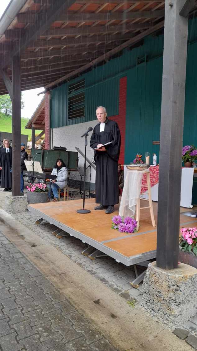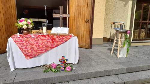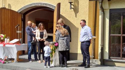 Gott sei Dank war er nicht weg. Mittendrin und dabei am Himmel Fahrt Tag im Freiluftgottesdienst auf dem Kirchplatz Friedenskirche. Eine bunt gemischte Gemeinde konnte es erleben. Das Wetter war ein Geschenk des Himmels. Zwei Taufen konnten gefeiert werden. Christus , der aufgefahren ist in den Himmel, hat nicht nur vorbeigeschaut.