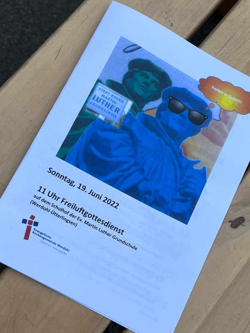 Die Ev. Martin-Luther Grundschule war Gastgeber für die Ev. Kirchengemeinde Werdohl. Auf dem Schulhof der Schule, überdacht von der Pausenhalle, wurde ein Freiluftgottesdienst gefeiert – Musik mit Bewegungsliedern, zwei Seligpreisungen von Jesus in Szene gesetzt, lecker Waffeln und Kaffee vom Förderverein im Anschluss, Sonnenschein und eine bunt gemischte Gemeinschaft.