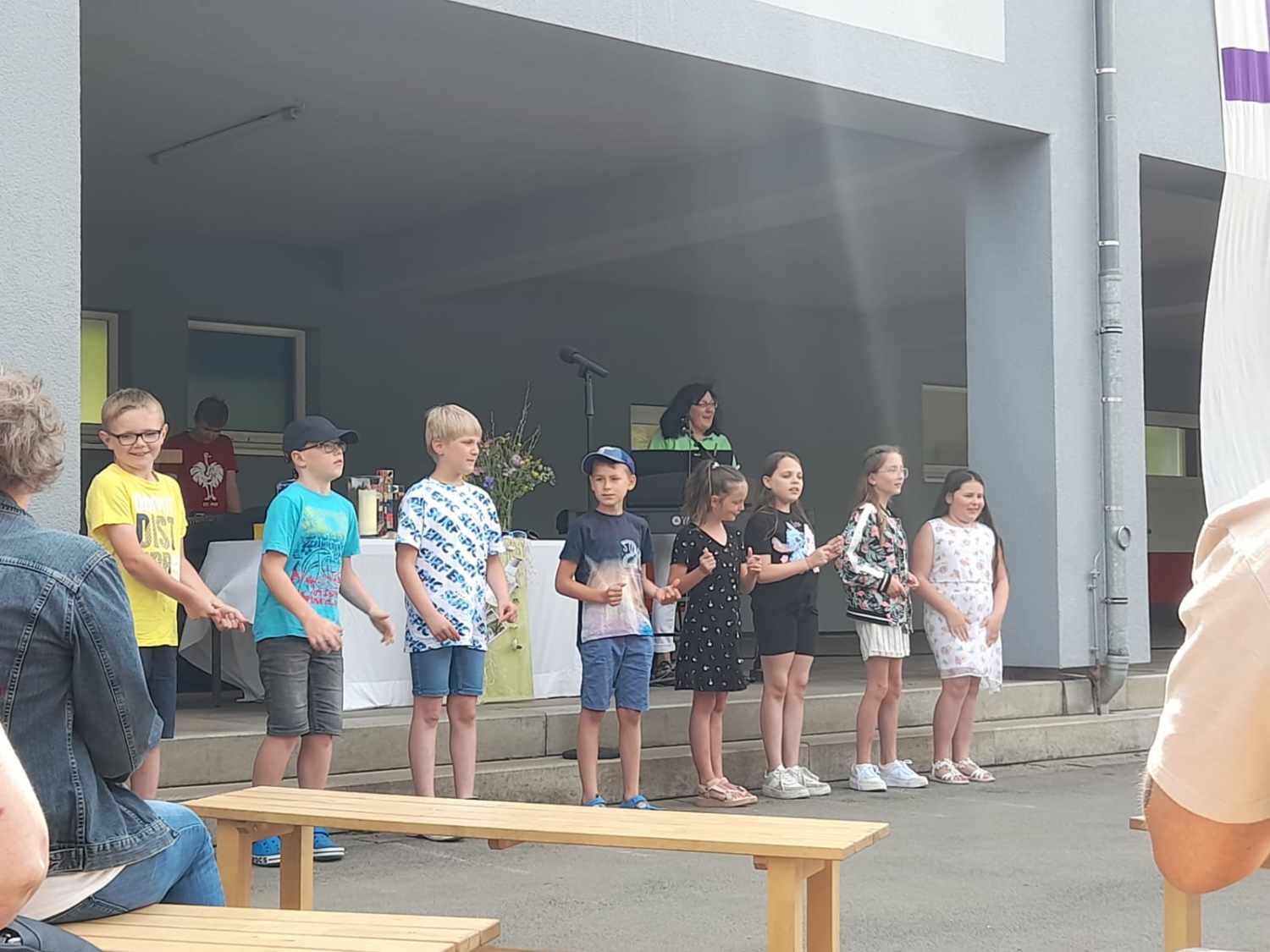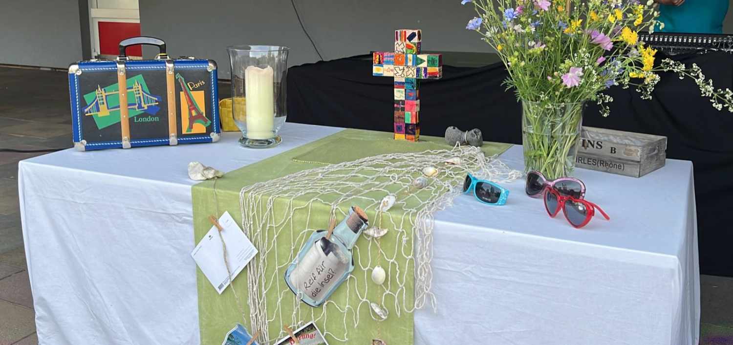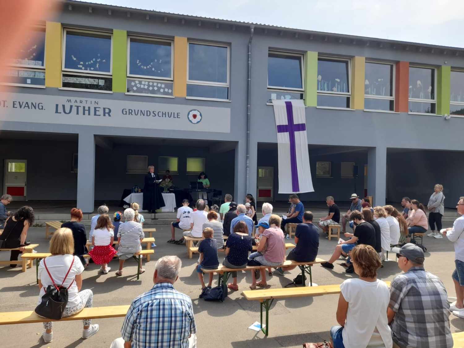 Die Ev. Martin-Luther Grundschule war Gastgeber für die Ev. Kirchengemeinde Werdohl. Auf dem Schulhof der Schule, überdacht von der Pausenhalle, wurde ein Freiluftgottesdienst gefeiert – Musik mit Bewegungsliedern, zwei Seligpreisungen von Jesus in Szene gesetzt, lecker Waffeln und Kaffee vom Förderverein im Anschluss, Sonnenschein und eine bunt gemischte Gemeinschaft.