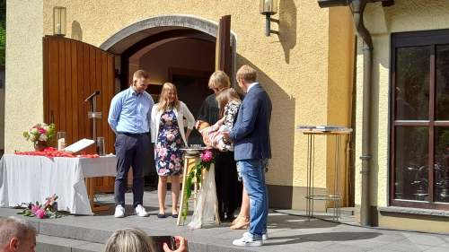 Gott sei Dank war er nicht weg. Mittendrin und dabei am Himmel Fahrt Tag im Freiluftgottesdienst auf dem Kirchplatz Friedenskirche. Eine bunt gemischte Gemeinde konnte es erleben. Das Wetter war ein Geschenk des Himmels. Zwei Taufen konnten gefeiert werden. Christus , der aufgefahren ist in den Himmel, hat nicht nur vorbeigeschaut.
